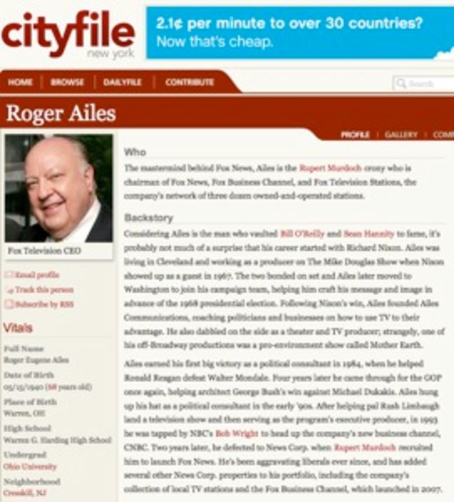 Accordingly, Cityfile will be providing background information capsules on people in the news for Gawker. As a taste, here's one little item on Roger Ailes, head of Fox News, who's in the news again today after David Carr's exposé on his press tactics. Ailes, notes Cityfile, is the only News Corporation executive apart from Rupert Murdoch entitled to company-paid "security services." He needs all the protection that the media conglomerate can buy.