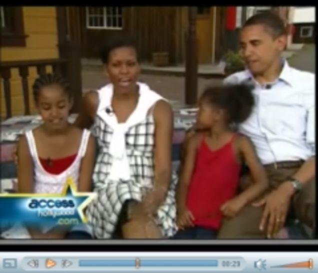 Barack Obama, his wife Michelle, and his daughters Malia Ann and Sasha all sat down for an adorable interview with Access Hollywood. They are sitting in, perhaps, some sort of backlot western town set. Someone named Maria Menounos is being all Access Hollywood-y at them. But still, in the 30s seconds of interview available so far, we have to admit that we don't hate Barack Obama's kids. They're making fun of his ratty old clothes, all sitcom-like! This celeb media offensive seems to be paying off. Maybe Michelle should become a Best Week Ever talking head or something next? Hooray for no substance! Clip after the jump.