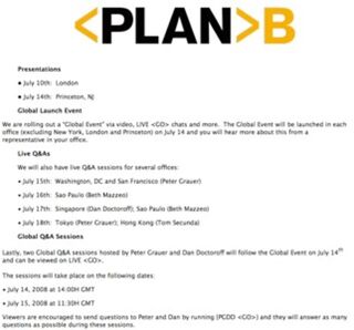 We really really want this: a video from the roadshow for Bloomberg's Plan B, a much-needed revamping of the financial news service. Writes a tipster: "They had a typically condescending presentation in NY, with actors wearing fish-heads interviewing Matt Winkler and other psychopaths." If you have a clip, email please!
