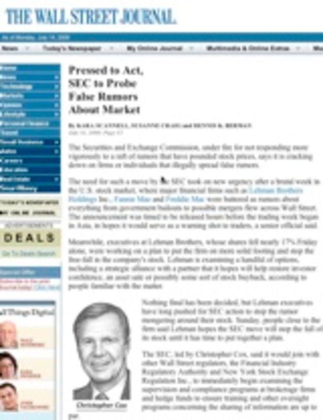 How many named sources do you think the Wall Street Journal used in its story on the SEC's crackdown on stock market rumormongering? One: the SEC. And how many anonymous sources? Twelve or more, it looks like, including "a senior official" at the SEC, "people close to the firm" Lehman Brothers, a "person familiar with the matter" and several sets of "people familiar with the matter." Of course, it's impossible to know how many of these citations are the same person appearing multiple times, so the actual number of anonymous sources could be lower. And, to be sure (*cough*), the SEC is ostensibly cracking down only on people who knowingly spreading false rumors for financial gain, which the Journal isn't doing. Further, most reporters consider their anonymously-sourced journalism a step or two above rumors. But if the SEC is going to investigate how some companies profit from derogatory rumors, shouldn't it also look into profit from positive gossip? Stuff like this, from the Journal: