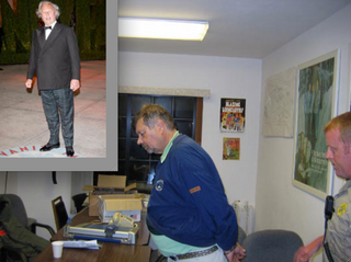Here's Vanity Fair writer Alex Shoumatoff, photographed shorty after he was arrested while infiltrating the private California super-elite men's club, Bohemian Grove. (That's VF editor-in-chief Graydon Carter, inset.) Pretty old-school reporting; we like it! We hear he was inside the club for about an hour and talked to a few members before his capture. But the unwanted photo-op was quite the indignity. Click for post-arrest photos!