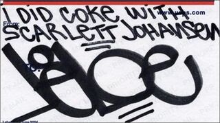 Blonde actress megastar Scarlett Johannson has been accused of drug use by a random graffiti tagger! But there's even more to the imaginary rendezvous; what did you and the busty Tom Waits fan do after the party, random graffiti tagger?: