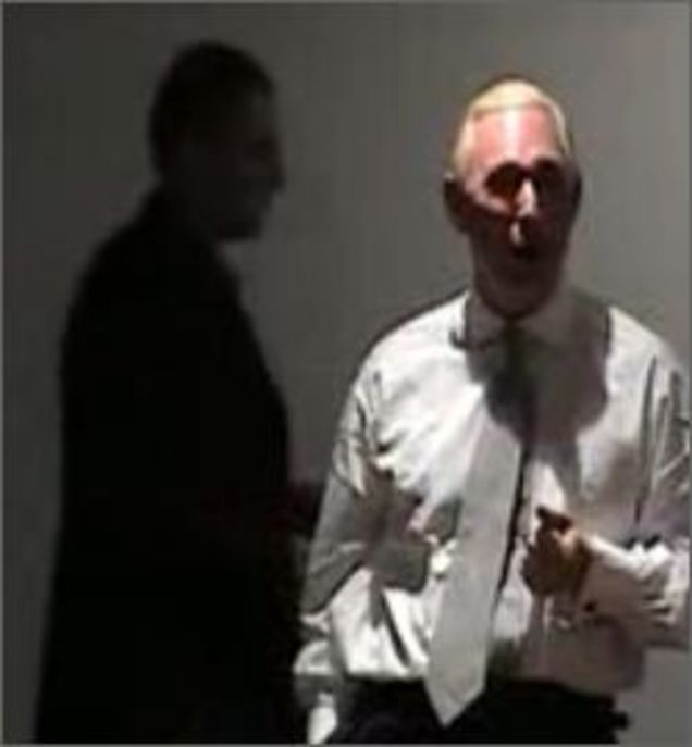 Our intrepid correspondent was barred from covering political attack man Roger Stone's speech at the offices of the bumbling, lowbrow 5WPR, but we win, because the entire speech is now on YouTube! Please watch all four poorly lit, nearly inaudible parts and let us know what he said. Plus we now have this picture of an appropriately shady-looking Ronn [sic] Torossian hovering behind an equally shady Stone! [YouTube]