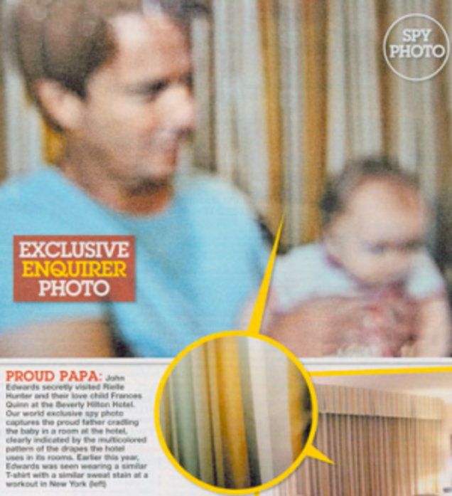 But now it is the internet's time to shine! Slate's done great by the story, with cranky Mickey Kaus justifying his insane anti-MSM crusade and Jack Shafer being his usual cantankerous and inarguably correct self. And hey, it's been good for Gawker too-nothing helps beat the August doldrums like a sex scandal that also allows for excoriation of Olde Media. Of course, not everyone on the internet has performed so honorably. It's bannable to mention the story at liberal blog powerhouse DailyKos, the HuffPo is still mostly quiet on it, and the Wikipedia edit war is staggering into its second contentious week. But now we have photos! Once there are pictures, the story is ready for television. If the Edwards love child was the Montauk Monster, CNN would've been all over it last week! And once the story is on television, the newspapers can finally go back and write about it, even if it's just a meta-media "oh dear what happened to the press on this one" kind of story. John himself has played this stupidly, running from reporters and hoping they'll maintain their vow of silence as long as he keeps his mouth shut. They will, John, because they love your wife, but they can only justify this to themselves for so long. Because, as you can see above, the photo is damning and ready-made for distribution on the internet or cable television.