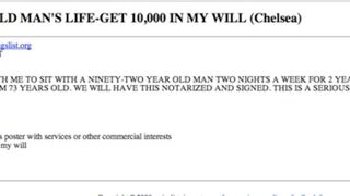 Look at it this way. Chill with the old dude a couple nights a week, donate his $10,000 to Meals on Wheels, and then write about your life-changing experience on the front page of The New York Times Magazine. Next, you parlay that little gem into best-selling memoir. The critics don't know how not to rave about such a thing. You'll get on Oprah, housewives will throw money at you. And, most importantly, you just might learn a thing or two about the little bundle of troubles that is you. Click through for full-size image. [Craigslist]