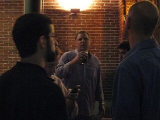 Jason Calacanis, the Mahalo CEO and email list administrator, and Michael Arrington, editor of TechCrunch and hero to hopeless website creators, held a meetup in Menlo Park last night for finalists in their TechCrunch50 startup beauty contest at the British Bankers Club. Our spy infiltrated the proceedings — and served Arrington a milkshake. "He didn't seem too happy about it," reports our informant. More photos from the event — including a surprise appearance from CNET TV star and former TechCrunch writer Natali Del Conte, who came after the proceedings were over for a brief tête-à-tête with Arrington.The crowd was small, our spy reports — "about 20-30 people, mostly TechCrunch50 finalists." SearchMe.com was one of the finalists — "some woman even Twittered that they got in." Arrington drives a gray Porsche, and "left with a ladyfriend, didn't get to see who." (Anyone know who he's dating? Do tell!) On to the pictures! Arrington, even as host, never could seem to crack a smile: