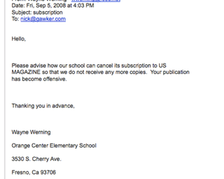 We just received a sternly-worded missive from the Orange Center Elementary School in Fresno, asking us to cancel their subscription to US Weekly. Presumably this is part of the wave of cancellations related to their totally controversial Sarah Palin coverage. This raises so many questions: what exactly is an elementary school doing with a subscription to US Weekly? And why did they e-mail us to cancel it?From: Wayne Werning [redacted] Date: Fri, Sep 5, 2008 at 4:03 PM Subject: subscription To: ——@gawker.com Hello, Please advise how our school can cancel its subscription to US MAGAZINE so that we do not receive any more copies. Your publication has become offensive. Thanking you in advance, Orange Center Elementary School 3530 S. Cherry Ave. Fresno, Ca 93706