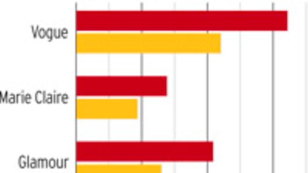 Project Runway is helping Elle fare the media recession far better than fashion-mag-competitor Vogue. Elle's all-important September issue has 7 percent more ads than last year compared with a 7 percent decline at Vogue. And as shown in the Ad Age graphic at left, Vogue's ad-page lead slipped January through September. And there are other reasons Anna Wintour should be pissed at herself for passing on the chance to tie Vogue into Runway: