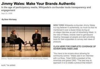 Wikipedia cofounder Jimmy Wales sat for an interview with ad agency exec Liz Ross in front of an Advertising Week audience here in New York yesterday. Which is odd, because Wales's very popular Wikipedia is a nonprofit which doesn't carry advertising, and Wales's for-profit venture, Wikia, isn't very popular. So who cares what he has to say?Wales himself, obviously. He can't resist a chance to burnish his image as a font of wisdom regarding all things Internet, no matter how irrelevant his experience might actually be. AdWeek's Brian Morrissey reports Wales used the word "authenticity" more than a dozen times while on stage.