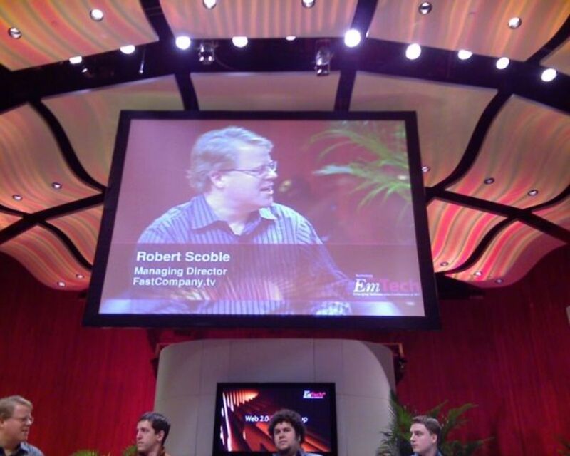 CAMBRIDGE, MASS. — Fast Company videoblogger Robert Scoble, who has discovered in the Web a popularity which escaped him in high school, has been moderating a panel titled "Web 2.0/Web 3.0 Mashup" at MIT's EmTech conference for the past hour. There are people from Facebook, Six Apart, and Plaxo on stage with him. With no introduction, Scoble launched into a meandering conversation about data portability, online video, URIs, social TV guides, and the Olympics. An hour later, it still has no sign of going anywhere. Joseph Smarr of Plaxo talks very fast. Dave Morin of Facebook seems very tired. Sample quote: "The pace of change is not indexable from a central service." The audience appears to be stunned into stupor. Does it matter that nothing is being said? Perhaps not; perhaps the point is to show this audience of technology generalists how insubstantial the obsessions of the Valley's geek set are.