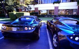 Of the handful of Tesla Roadster coupes on America's byways, guess where you can find two parked side by side? At the office of Tesla Motors investor Draper Fisher Jurvetson on Sand Hill Road. They even have matching paint jobs! Mock away your envy in the comments — best effort becomes the new title. Yesterday's winner was UTnick with "This banner printed in Mexico." (Photo by Steve Jurvetson)