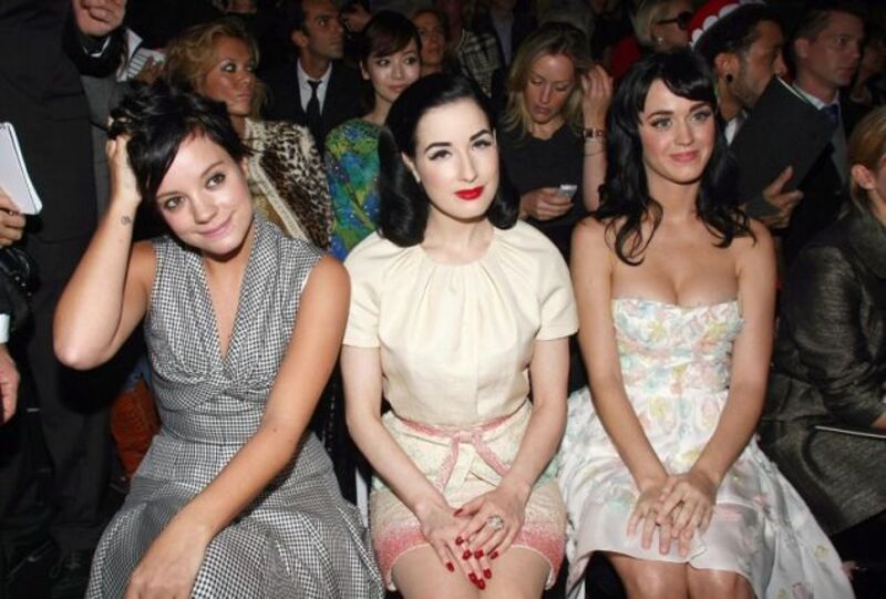 [Chekhov "joke"! Drunky singer Lily Allen, burlesque china doll Dita Von Teese, and Jill Sobule burglar Katy Perry at the Dior show for Paris Fashion Week today; image via Bauer-Griffin]
