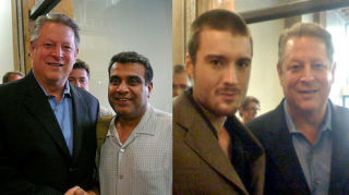 GigaOm's Om Malik and Mashable's Pete Cashmore like to present themselves as leaders of a new kind of Web 2.0 journalism. Both turned up at Current TV's offices Friday, ostensibly to cover Current's Twitter-enhanced coverage of the first Presidential debate. Truth is, Current's publicists had called reporters to tip us off that executive chairman of the board Al Gore would be there. Gore didn't bother to use Twitter himself — he didn't even stick around for the debate. But he did take time to pose for photos.Malik and Cashmore, perhaps taking a cue, didn't do any real reporting on the event, leaving that to Threat Level and Laughing Squid. The two simply blogged their Al-and-me pictures as news stories on GigaOm and Mashable, bringing themselves one step closer to the old media stereotype of the vain reporter who can't stop inserting himself into the story — or in this case, into the non-story.