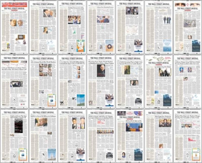 The Wall Street Journal abandoned its restrained front page design just in time. The staid business newspaper has captured the month's growing financial alarm—and contributed to it—with dramatic headlines often stretching across all six columns of the front page. The growing point size of the headlines is a graphic measure of the gathering crisis. The first splash headline came on Monday 15th September as Lehman Brothers teetered. Since then, the Journal has given the panic treatment to eight more front pages, most recently in today's dire summary of the news: Bailout Plan Rejected, Markets Plunge, Forcing New Scramble to Solve Crisis. The month (and the Jewish year) is over. But it's not the last time newspapers will break out the big fonts. Click for high-definition version of the collage.