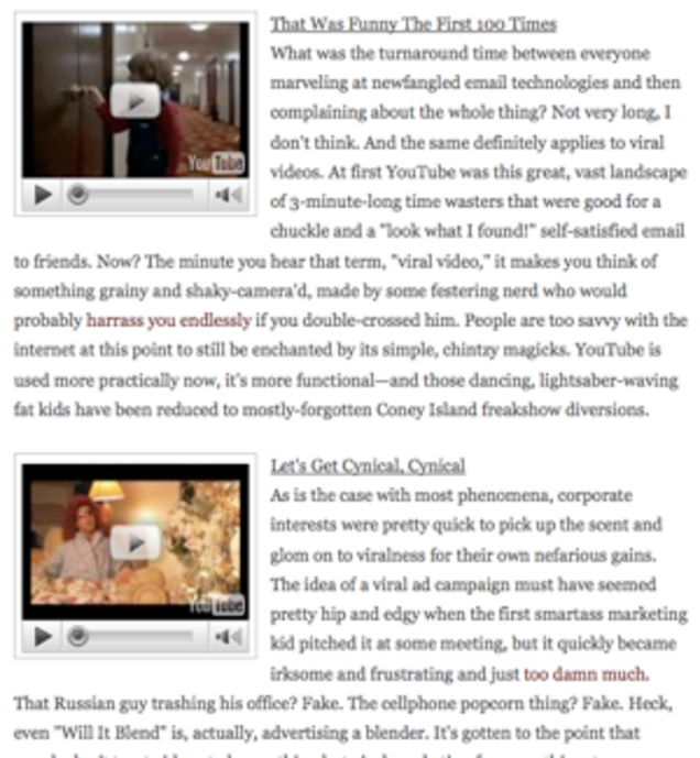 That Was Funny The First 100 Times What was the turnaround time between everyone marveling at newfangled email technologies and then complaining about the whole thing? Not very long, I don't think. And the same definitely applies to viral videos. At first YouTube was this great, vast landscape of 3-minute-long time wasters that were good for a chuckle and a "look what I found!" self-satisfied email to friends. Now? The minute you hear that term, "viral video," it makes you think of something grainy and shaky-camera'd, made by some festering nerd who would probably harrass you endlessly if you double-crossed him. People are too savvy with the internet at this point to still be enchanted by its simple, chintzy magicks. YouTube is used more practically now, it's more functional—and those dancing, lightsaber-waving fat kids have been reduced to mostly-forgotten Coney Island freakshow diversions.
