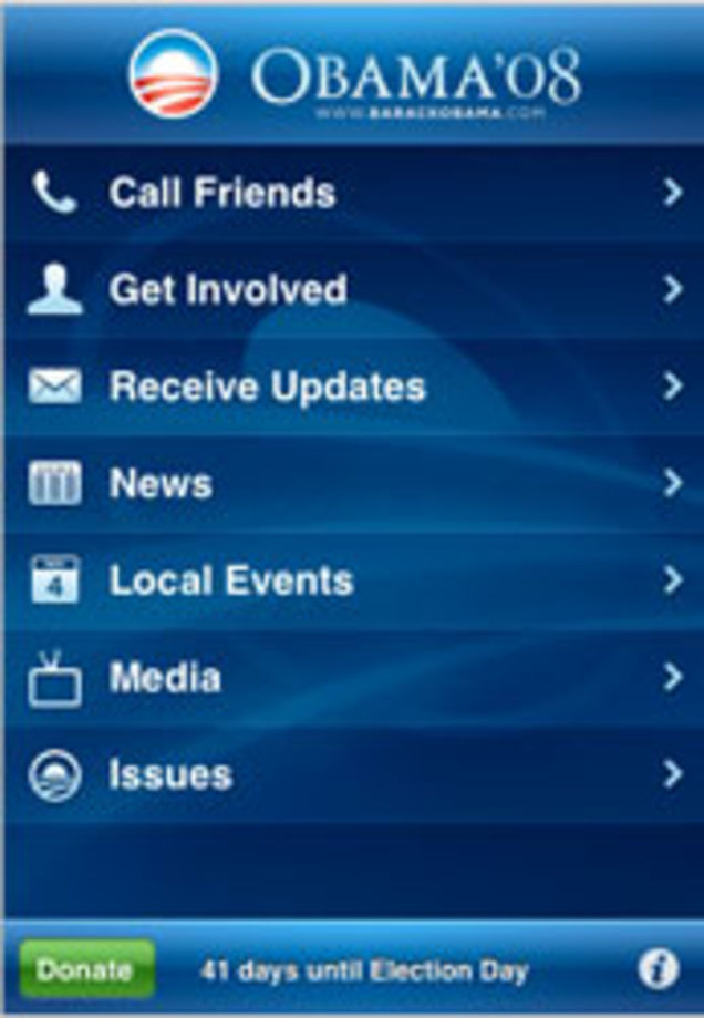 What took so long? Obama '08, the iPhone app, is free. Sort of: There's no charge, but the app will try to put you to work dialing friends in battleground states. CNET non-Democrat Declan McCullagh test-drove it: "The application ranked contacts in Colorado, Michigan, and New Mexico at the top; at the bottom was a friend whose cell phone has a Texas number, though she actually lives in California." The app's controversial feature is that it reports back to Obama Central on the total number of calls you've dialed.