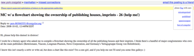 A young literary agency lass is having trouble making, like, a flowchart of all the publishers! She's taken to the Craigslist personals section for the cure: "I think there's a handful of major conglomerates who own all the main publishers... Does a chart like this exist? I'm a cute girl, and if you help me out I'll send you some free galleys :)" Hey, Ms. Cutie? We just busted you. Consider it your first lesson in tough love, and please take to heart the advice Toby Young just gave me: "Don't get too comfortable. You could be fired in the next 48 hours." In this climate, we're all lucky just to have a job. So do yours.