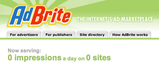 We knew things were looking grim in the fatally overcrowded online ad-network space. But this is ridiculous. AdBrite's homepage currently states that the network, favored by smaller publishers, is serving "0 impressions a day on 0 sites." A glitch in its stats mechanism, surely — but also a harbinger of the shakeout to come. We hear persistent rumors of high turnover in the site's sales department.