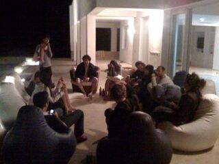 What plots are the members of "Camp Cyprus," a group of young webheads, cooking up? Perhaps we'll read about them in a Wall Street Journal front-page A-hed, since reporter Jessica Vascellaro was on the scene, along with Wall Street-scion boyfriend Sam Lessin, the CEO of Drop.io. Can you think of a better caption? Leave it in the comments; the best one will become the new headline of the post. Yesterday's winner: TheChris2.0, for "McCain and Whitman unveil Social Security plan." (Photo by Sam Lessin)