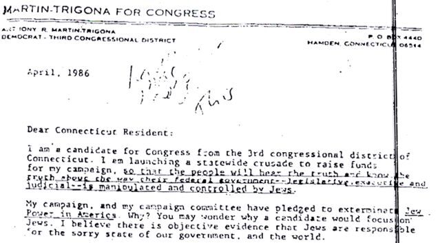 Andy Martin is the guy who invented the magical story of Barack Obama's secret Muslim upbringing. This story still convinces dumb old people, all the time, when they read it in their emails. Then they ask John McCain about it and he is kind of embarrassed but they still believe it, pretty much. Andy Martin is also an insane racist lunatic who used to run for office a lot. In 1986, he ran for Congress from Connecticut. He sent this amazing letter out to voters. If elected, Martin promised to "exterminate Jew Power in America." Because Jews are "schooled in blood sucking and money grubbing from birth." The letter goes on like that at great length. You can read the whole thing at The Smoking Gun! Oh, and Sean Hannity had this guy on his show to talk about Obama's secret Muslim background. Hannity didn't mention the money-grubbing Jews bit. [TSG]