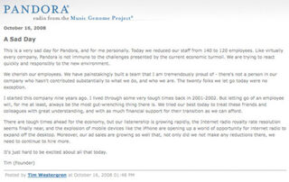 Not even the biz reporters we reblog have much to say about Pandora laying off 20 of its 140 employees. Last month, founder Tim Westergren had sent out warning signals that online music royalties could be a problem. Cutting 14.2 percent of staff this week, though, seems more pro forma than panic. Westergren's "A Sad Day" bears no news, but serves as an intriguing template of that new writing genre, the layoff blog post. Spot the patterns: