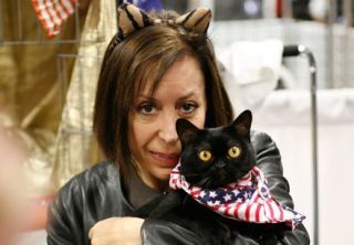 New York Post columnist Andrea Peyser is that degraded newspaper's usual voice of outrage, which is why she usually looks like this. But from now on we will use this photo of Peyser, in cat ears, cuddling with little "Barack Obama" at the CFA-Iams Cat Show this week. How could this be the same woman who wrote FELONIOUS BALL OF FUR DESERVED EVERY BLOW just last month? [MSG.com, Photo: Chad Batka]