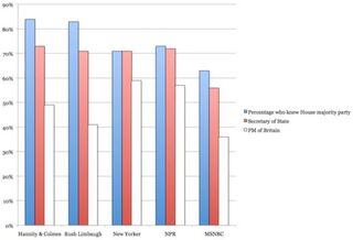 Let's take a look at the original data from Pew Research. Only 71% of the readers of the New Yorker or The Atlantic could name the House majority party or the Secretary of State. So who scores highest? Viewers of conservative shouting head Sean Hannity on Fox News and radio host Rush Limbaugh.
