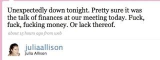 This is from dating columnist and startup Nonsociety lifestreamer Julia Allison's Twitter. Welcome to how the other half lives! (Her salary at Star last year was $100K—just so you know.)
