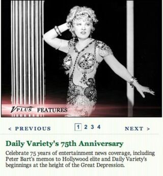 Happy 75th, Variety! Defamer wishes the best of anniversaries to Daily Variety, which today celebrates 75 years in business — albeit a month late, as is customary with so many of its biggest stories, but in a festive, infectious spirit nonetheless. Not to mention surprising as well, according to the blurb featured on its Web site's front page; we knew Peter Bart had been tottering around the deck for a while now, but to think Bart himself may have once run the printer with one hand while memoing Gone With the Wind notes to Louis Mayer with the other... Well, kudos indeed. And don't stay up too late partying! [Variety]