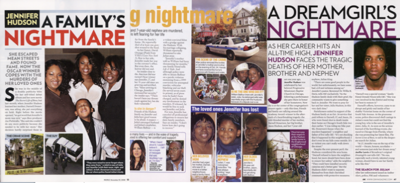 Yesterday we took a look at the celebrity glossies' websites, to get a sense of how this weeks issues would cover the Jennifer Hudson story. People and Us Weekly seemed like they planned to devote the most space reporting on the murders of the singer/actress's mother, brother, and nephew. And, sure enough, they were the only two to run the story as the main image on their covers. But what's inside? Us spoke with people who described the inciting incident, a fight between Hudson's brother and the man suspected of doing the killings. That story isn't really featured in any of the other five magazines we looked at, so I guess Us gets the points for that. People's is typically heavy on the personal interest, though surprisingly they didn't set aside a space for other celebrities to weigh in on the tragedy, as three others, Life & Style (they got fellow Chicagoan Barack Obama!), Us, and InTouch, did. They pretty much all have the same photos, especially the terribly cute and just, well, terribly sad photos of Hudson's seven-year-old nephew. So, who wins? Us Weekly, we guess. Though, it also kind of feels like nobody won.