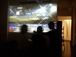 The above shot is from the swank party at Gawker Media overlord Nick Denton's SoHo loft. Obviously we can't all have elite LCD wall projectors and a fancy media crowd because some of us are stuck in John McCain's REAL America, or maybe Brooklyn. All the more reason to send us pictures of your electoral shindigs tonight. Help us diversify this post! Mail your shots (however blurry/explicit/incriminating) to tips@gawker.com or post in the comments. We'll keep your name out of it unless you tell us otherwise. (Elitist parties are OK too. Heck, encouraged, even.) After the jump, the exciting scene at Gawker HQ. UPDATE: And more! (Last new photo: 11:52 p.m.)