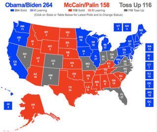 With states that have been called so far added to the obvious gimmes, Obama is a scant six electoral votes from victory. A victory in any of the gray states on this map will give him the presidency.