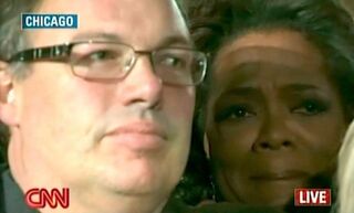 Barack Obama's ascent to the presidency tonight was a perfect moment of cinema: A graceful conciliation by his opponent, dramatic music at Grant Park in Chicago, a moving speech and a picture-perfect finish surrounded by family and his vice president. Also: Crying. Not only by the Democrats in attendance but, from what we can tell, even among some Republians. "I was crying and I despise the Dems," one tipster admitted to us. MSNBC cut to a gently weeping Oprah Winfrey as Obama reached the "Yes, We Can" crescendo of his spech; some other criers follow below. Good luck not choking up again.