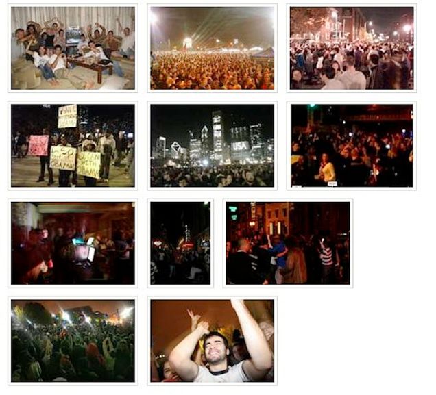 Spontaneous street parties are forming in the wake of Barack Obama's election to the presidency, and we've been getting emails about it. After the jump, shots taken in the streets of San Francisco, DC, Philly, New Orleans, Chicago and Baltimore and various parts of New York — and even in Freeport, Sierra Leone. Send us shots of your own and we'll add them to the galleries, or feel free to post in the comments. In the meantime, try not to get too drunk or start throwing anything or pushing anyone. (We're hopeful you won't, hopeys.)