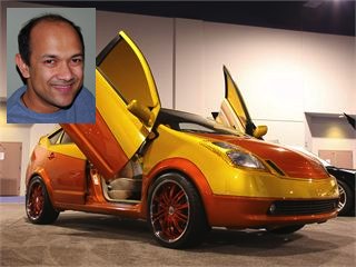 After Yahoo bought email startup Zimbra for $350 million, where did the money go? Cofounder and CEO Satish Dharmaraj put at least some of it down on a customized Toyota Prius, now on display at the SEMA auto show in Las Vegas. The yellow-and-orange car was so outrageously over the top it made even the heartless carbloggers at Jalopnik weep.The Prius features an extended battery for all-electric operation — how green! (Unless you count the coal which more than likely generated most of that electricity.) MyRide says that Dharmaraj's outré choice of scissor-wing doors means "the Lamborghini-door trend is officially over." (Photo by MyRide)