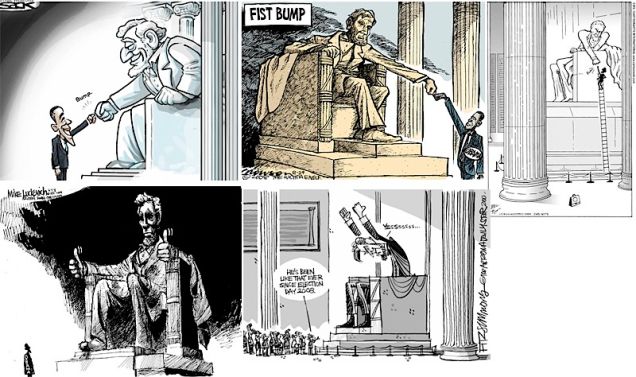 The urge to draw, literally, a link between Abraham Lincoln and Barack Obama would have been irresistible to editorial cartoonists even if both men were not Illinois legislators, outspoken against a foreign military adventure and exploitive of their hardscrabble upbringings in the national hinterlands. Who better to juxtapose with the country's first black president than the commander-in-chief who emancipated American slaves (even if Obama's ancestors were not among them)?