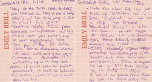 Oh Emily Brill. The blogging (she's Hamilton's favorite New York writer, for serious) media heiress has stooped to our level. Last night she decided to swallow the horse pill of her pride and watch an episode of bitchy Upper East Side teen soap opera The McLaughlin Group Gossip Girl, and then wrote about it! It could be seen as direct competition for our swatting-at-a-bug-zapper ramblings about the show, except it's much better and, like, informed. You see, unlike us, she's from the world of dough-headed Upper East Side kids, so she can totes relate (or not) to all the interesting characters. She took notes, with her hands!, last night, weighing in on important matters like "is Blair wearing Juicy?" and "did you know that most girls I know... do not like 1Oak??" I did not know! She's posted the chicken scratch on her little website and we've put the pages down below for you too, in case you're lazy (you are). David Mamet scribbles on napkins too, Emily! See what you can parse. It's kinda hard. I think she insults the Bronx in some capacity.