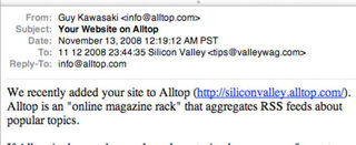 This is no coincidence, folks. Nick Denton soft-shutters our site and boom, we're added to Guy Kawasaki's "online magazine rack" Alltop within 24 hours. Guy's not afraid to play hockey with us anymore. Slapshot to the face! Guy, I'm a French-Canadian goalie. You'll be surprised how many of those I can take.
