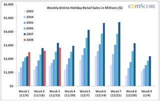 Brad Stone blogged the bad news: "During the first 23 days of November, according to a report to be released later on Tuesday by the research firm comScore, consumers spent $8.19 billion online, a 4 percent drop from the same period last year. That marks the first annual decline since e-commerce took off." You can read the rest of the tragic stats in ComScore's press release.