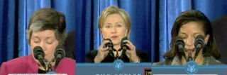 Sure, Barack Obama appointed a number of women to prominent positions in his national security team, but he is still a patent misogynistic. How else to explain the terrible set-up of the podium at his press conference this morning? All the women had to readjust the microphones, which still looked like they were coming out of their heads. It's too much work to get a little milk crate for Hillary and Janet and Susan? We know Obama's a master of stagecraft and political spectacle, so we can only imagine that this was totally 100% intentional, appointing all these short women who you can barely see. After all, Robert Reich didn't have to speak at the economic team press conference, did he? Click for our video compilation of mic-adjusting humiliation!
