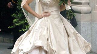 Ladies, there's no reason to copy Carrie Bradshaw, who is a fictional character, in everything she does. For example, Page Six reports that bridal designer Gabriella Risatti will knock off 30 copies of the wedding dress that she wore in the Sex and the City movie. Um, hello? That's the dress that she was wearing when Big left her at the altar. (When they got married for real she wore a tasteful suit at City Hall.) The actual Vivienne Westwood dress, which was fairly ridiculous in the first place—that was the point! that the much-vaunted big wedding was hubristic and silly!—does not come avec bird-on-head hairpiece.