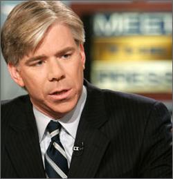 People across the political spectrum had mixed feelings about Tim Russert, the recently deceased former host of Meet The Press. But whether you thought he was the toughest interviewer in DC or a toadying cock-gobbler to power, you had to admit that he probably got his job based on a genuine zeal for reporting, rather than because he was some network exec's ideal of a telegenic newsman. Now that David Gregory has taken over the gig, we'll get to see the network-ideal-telegenic-gasbag type in action. Problem one: his insincere self-deprecation skills: