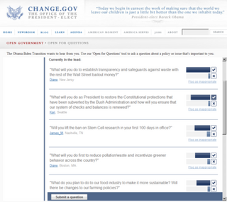 Do you have a question for Barack Obama? Sure you do! Barack Obama has a thing on his website where you can ask questions of him and the transition and, eventually, his administration. Of course, many politicians have these easily ignored comments sections for questions, on their sites, but this one is different: it's got Digg-style voting! So far there are 78,934 votes on 1,192 questions, and the winner is a lame softball along the lines of "what will you do to establish transparency and eliminate waste and how warm and nice, exactly, will the hug you give all of America be, once you're in office?" Surely the internet can "crowdsource" some better questions than that.