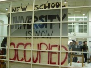 From within the occupied New School in Exile, 65 5th Avenue, New York City:We have been in occupation of the Graduate Faculty building of the New School University since 8pm Wednesday the 17th of December. More than 100 of us have taken over a student building, including our only library, which the administration has marked for demolition without creating any equivalent new space on campus. We have opened the building as a student-run autonomous space, in protest against the administration of President Bob Kerrey who recently received a vote of no confidence from the majority of faculty in this school. Details of our multiple grievances against Kerrey, his vice-President Jim Murtha, and treasurer of the board of trustees Robert Millard are laid out in our first communiqué. This morning we have an update on our situation. At around noon today New School security moved to block our access to the fire exits, preventing us from allowing in our fellow students of the Inter-University Consortium to whom they had refused access to the building in a violation of the Consortium agreement. When they failed to remove us, the NYPD were sent in to violently evict us from the fire exit and one of our fellow students was arrested. The police entered the building at the same time as President Kerrey arrived and offered to speak with us, we responded by refusing to negotiate with him and repeating our demand that he immediately resign. He left and took his police with him. At the moment our security has returned and our numbers have doubled, but we expect future incursions on our space and encourage all who support us to come to the Graduate Building at 65 5th Avenue and 14th street.