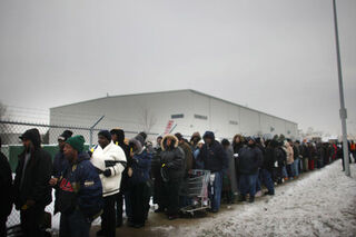Detroiters line up today for items like food, toiletries, and toys in one of the poorest areas in the country, with a vast underclass and barely-perceptible aboveground economy colliding with the long-dead auto industry. [Getty]