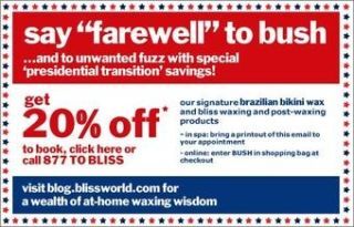 "Say 'farewell to Bush'"—with 20% off a Brazilian bikini wax at Bliss Spa! Yea, the joke is hackneyed. But at least the motherfucker was finally good for something. [Blissworld]