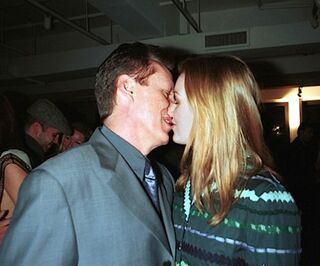 Reads the caption on the Getty pic: "Actor James Woods kisses Hilary Rowland at the Cerruti Showroom Fall/Winter Fashion Show 2001/2002 party January 29, 2001 in New York City." It sure looks like that's what is going on here. But maybe the famous actor and the infamous name-dropper are just talking, really closely, and Rowland's eyes are only closed because she's blinking or something. Sure!