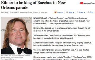 Val Kilmer will preside over the Krewe of Bacchus parade that strolls through New Orleans two days before Mardi Gras, blissfully intoxicated on a heady mixture of beignet creme and boxed wine.