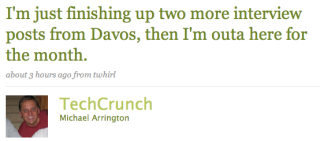 First the voluble tech blogger, an opinionated chronicler of the obscurest of Web startups, announced BusinessWeek online columnist Sarah Lacy as a substitute writer. Then he said he had to file two more interviews from Davos, the power conference of the world's economic hyperelite. Then he announced another substitute.