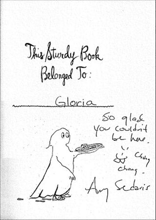 It was noted in the comments on the Cyrus post that the teen star is from Nashville; hipster comedy goddess Sedaris is from Raleigh, North Carolina (by way of upstate New York), if you're into judging people by geography. Above is an image taken from a book signed by Sedaris on behalf of a Chinese American man's sister in Pennsylvania.